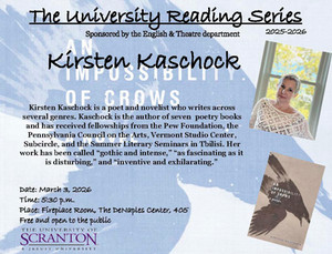 Kirsten Kaschock is a poet and novelist who writes across several genres. She will give a reading from her lastest book, "An Impossiblility of Crows" on March 3, 2026 at 5:30 p.m. in The DeNaples Center, Fireplace room 405.