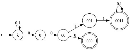 In words, L2 contains precisely those strings over the alphabet {0,1} having either 000 as a suffix or 0011 as a substring.