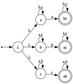Solution: Here, the machine initially "guesses" which of the three symbols will occur exactly once and follows the corresponding λ-transition.