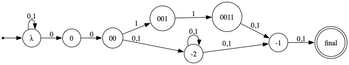 Upon close examination, one notices that any string by which the machine can get to the final state via a path involving states 001 and 0011 also allows for a path to the final state involving the states -2 and -1 instead. Hence, the states 001 and 0011 (and all incident transitions, of course) can be omitted.